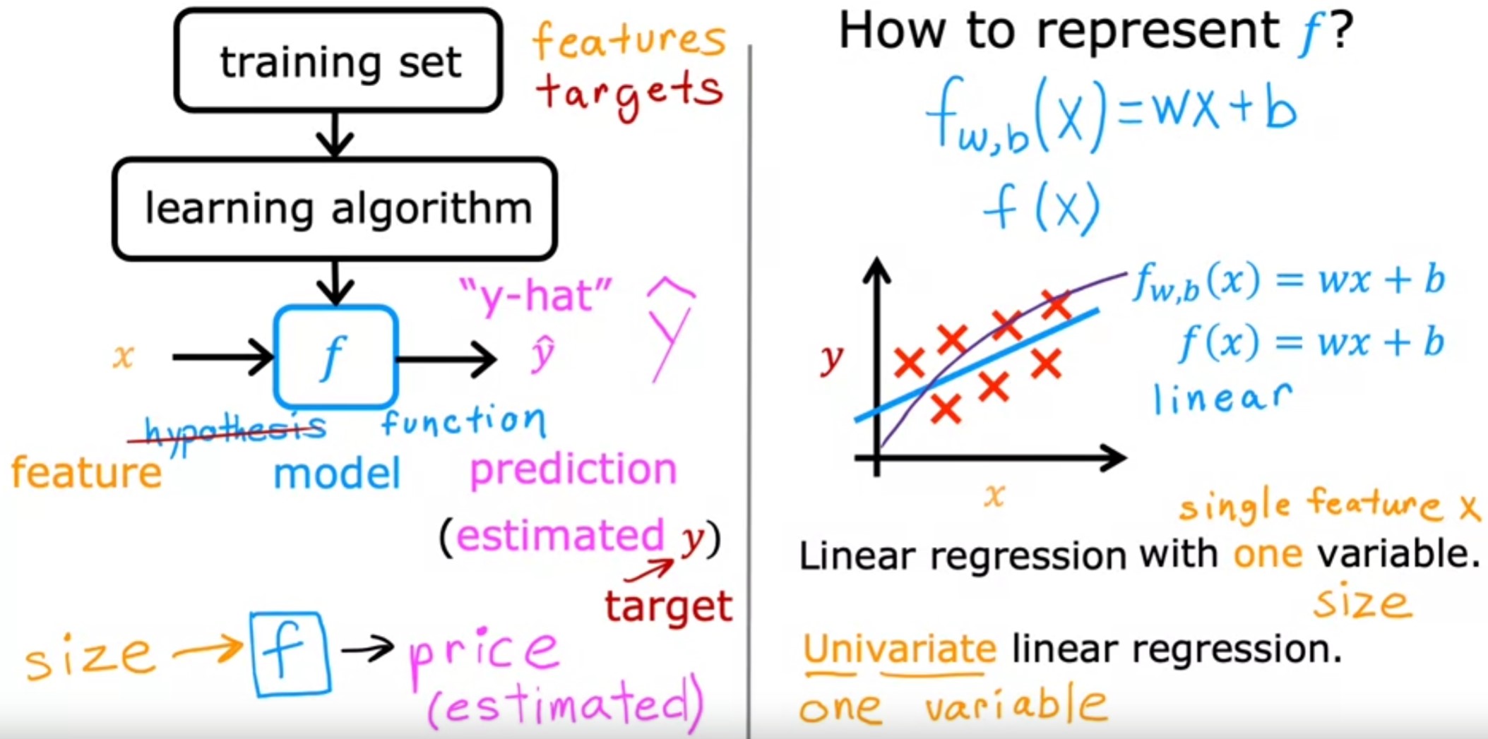 hypothesis,. The function f is called the model. - A key question is, how are we going to represent the function f? Or in other words, what is the math formula we’re going to use to compute f?