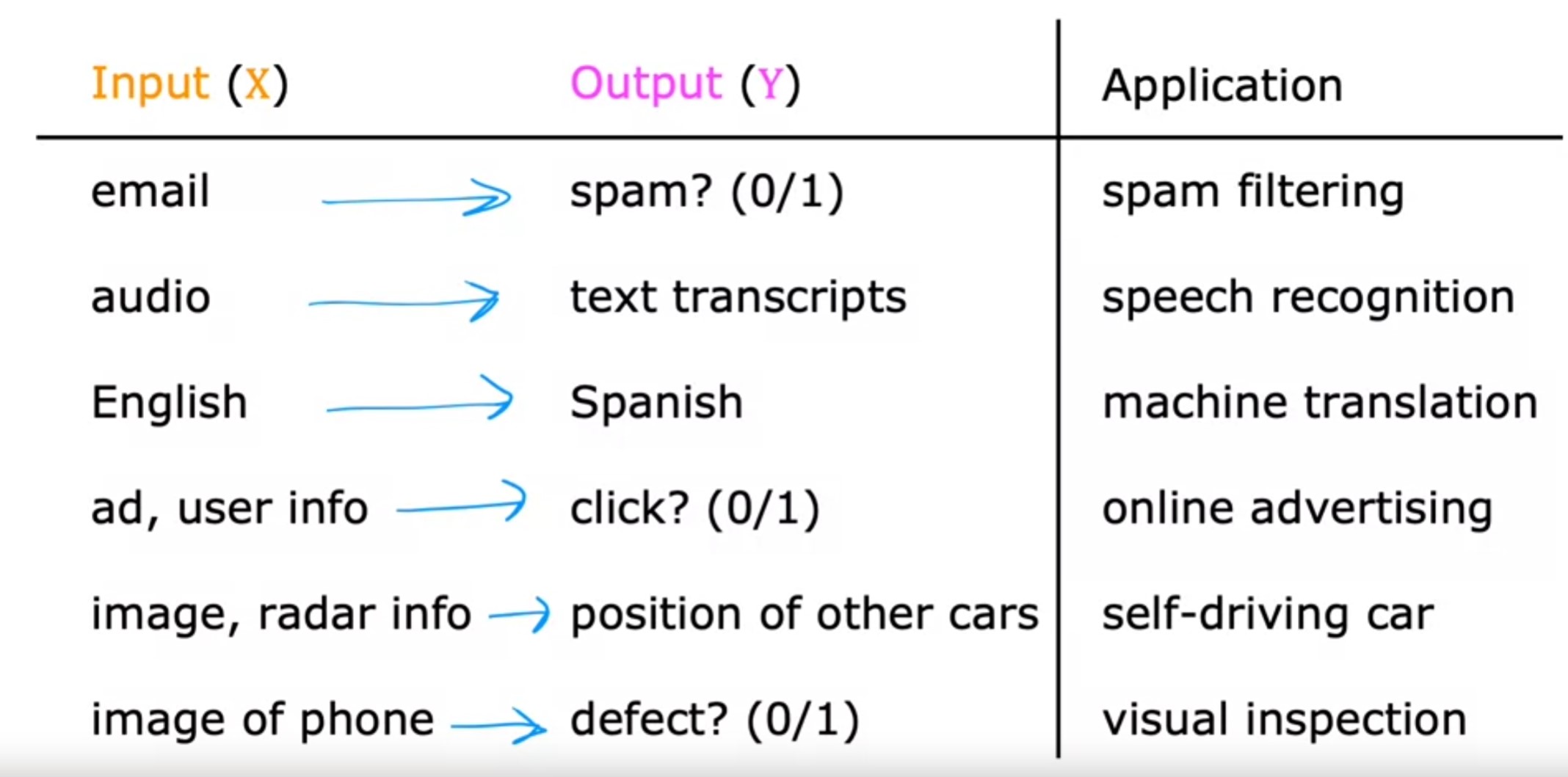 - Supervised learning, refers to algorithms that learn x to y or input to output mappings.