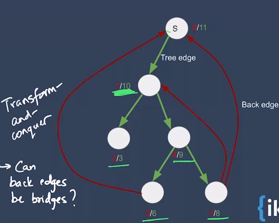 To do this, we use the concept of arrival times. There could be back edges from any of the descendent nodes to any of the ancestors. So we check if the arrival time is shorter than the arrival time of the current node, then we can reach the ancestor. if so, the edge between the given node and its parent is not a bridge.