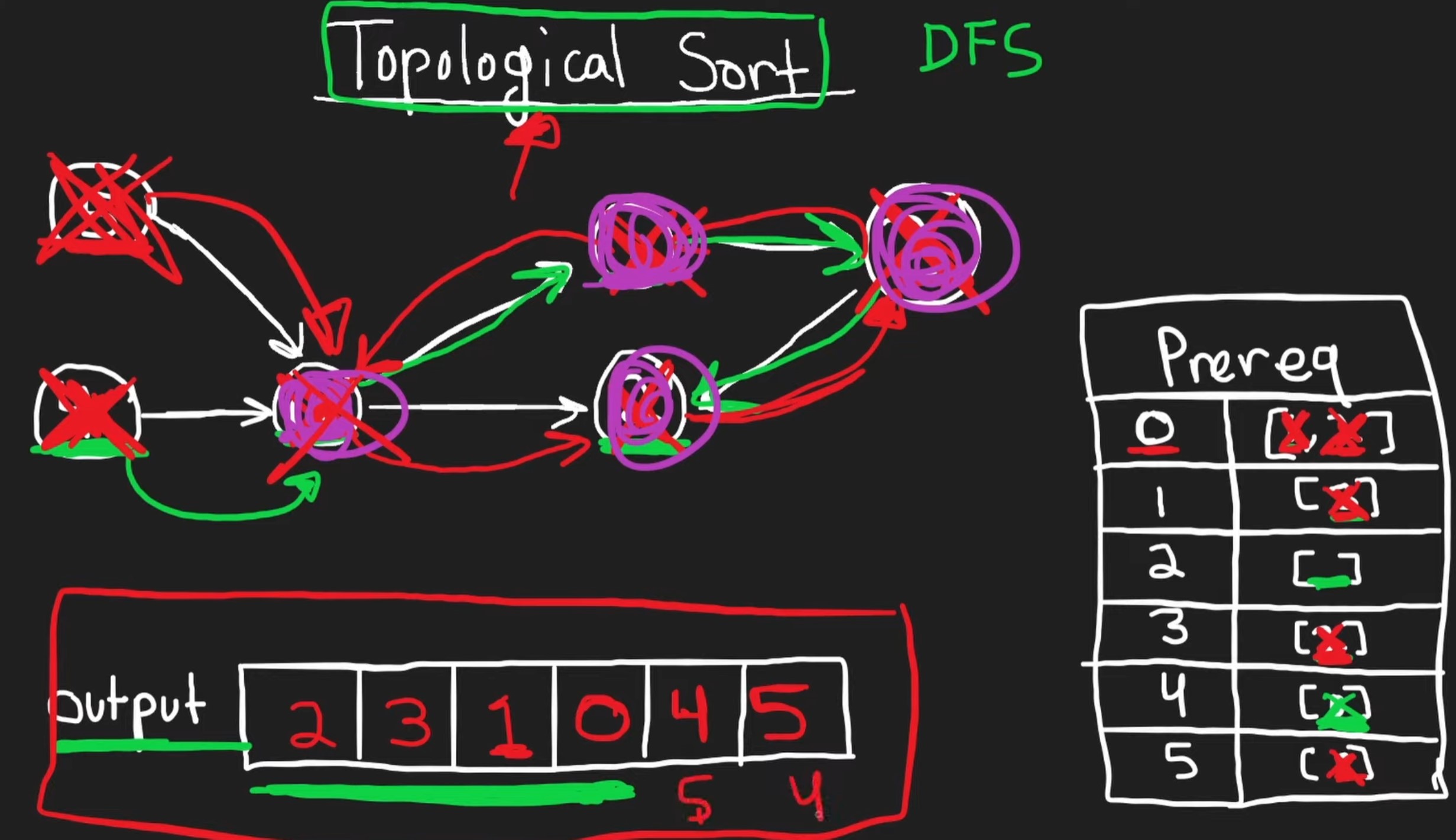 - Traverse until a course has no prerequisite. Add it to the output. Cross it out as we never have to visit this node again.