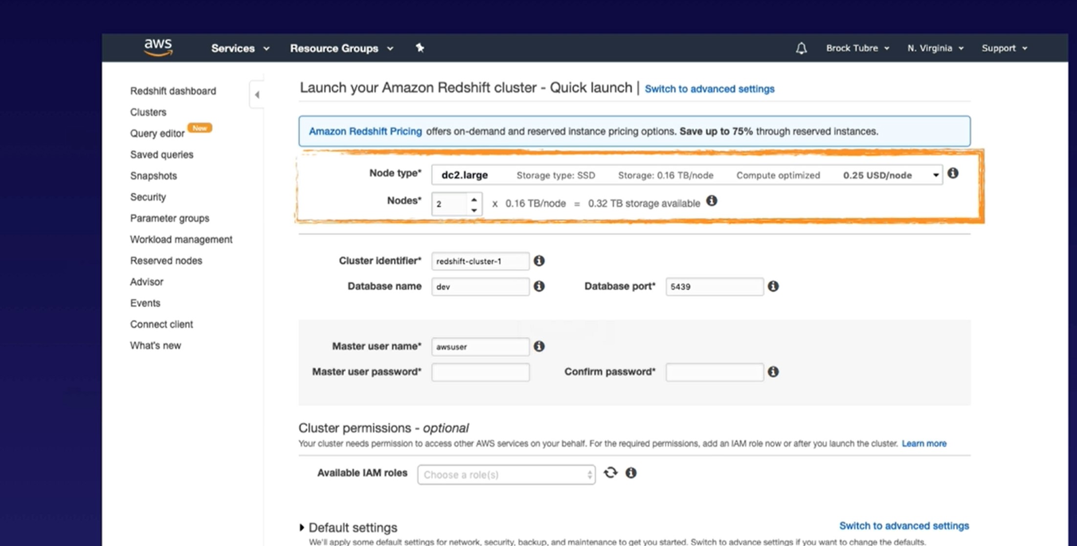 - Within the console, you can launch your Amazon Redshift cluster, select the number of nodes that you want, their storage size,and other parameters to create your data warehousing solution.