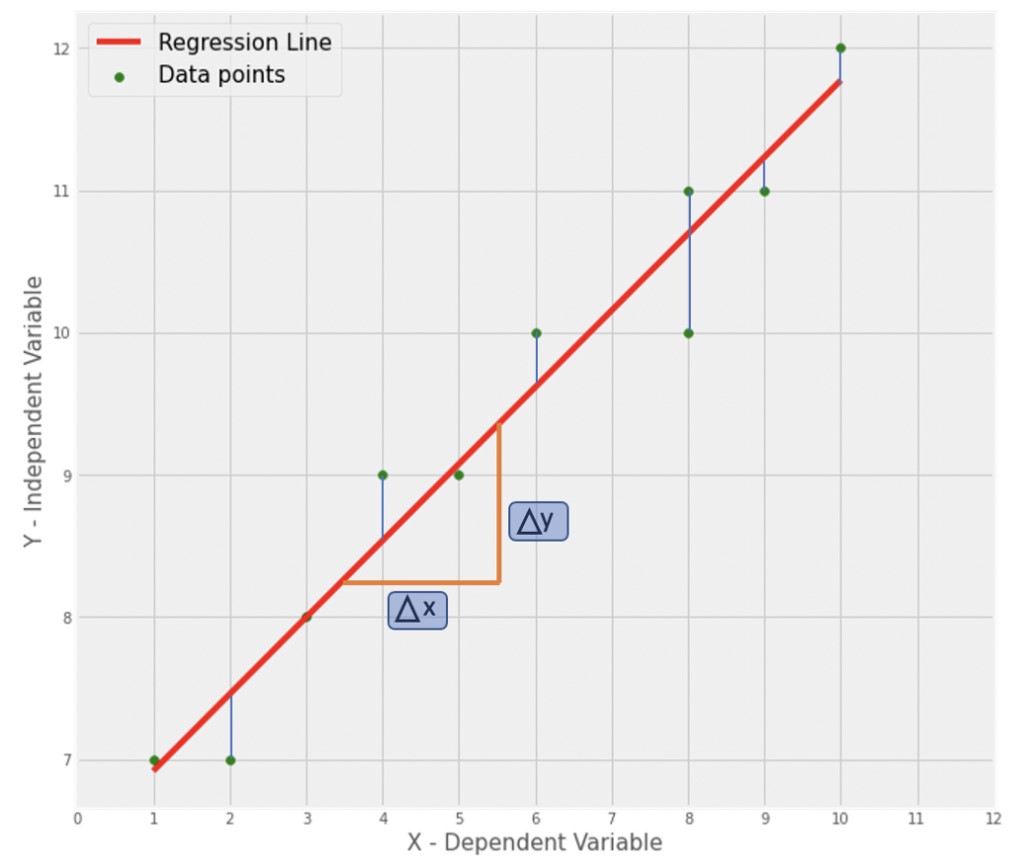 Formula to calculate slope and intercept: \[\begin{eqnarray} \text{slope} = \frac{\Delta Y}{\Delta X} \nonumber \\\ \Delta Y = ((np.mean(X) \times np.mean(Y)) - np.mean(X \times Y)) \nonumber \\\ \Delta X = ((np.mean(X)^2) - np.mean(X \times Y)) \nonumber \\\ \boxed{m = Δ𝑦 / Δ𝑥} \end{eqnarray}\]